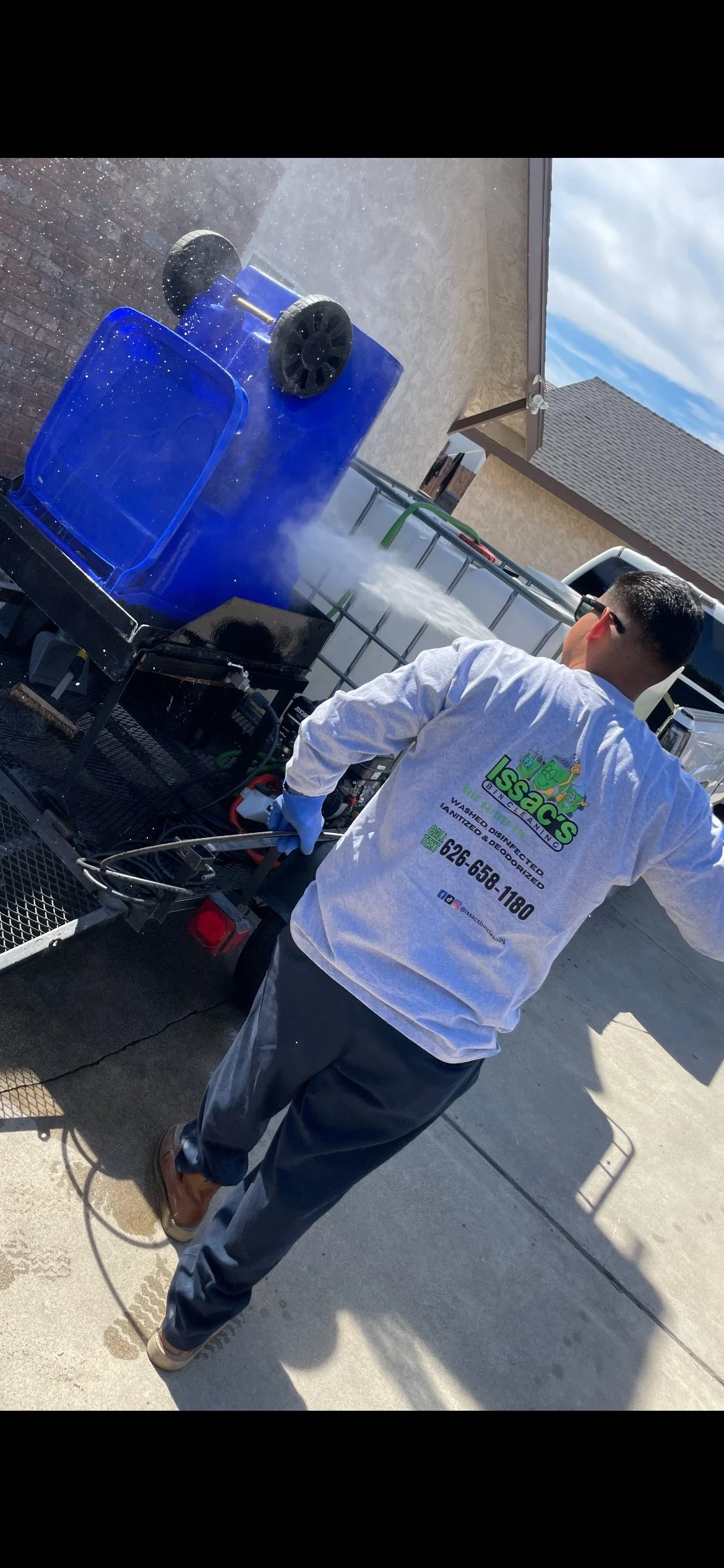 Trash cans will be cleaned from the curb side by means of a high powered pressure washing trailer rig.